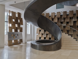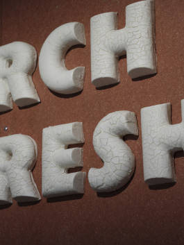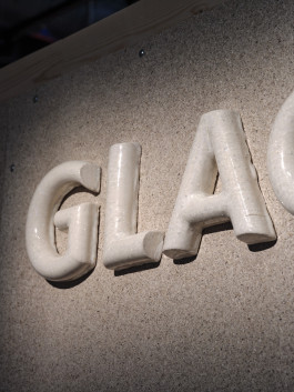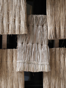 The thatched display to the entrance is a showcase of the many wetland plants used to produce innovative sheet materials used through the exhibition. The thatched wall includes UK-sourced plants such as reeds, rushes and grasses bound together by master thatcher Mark Harrington and expert weaver Mollie McMillen. The temporary walls inside the gallery are lined with boards made from wetland fibres, hemp, wheat and straw. The signage in the entrance and in the gallery is stoneware made with London clay pigment collected from SW2.