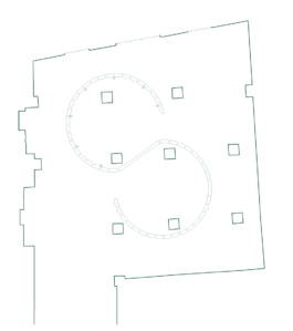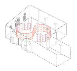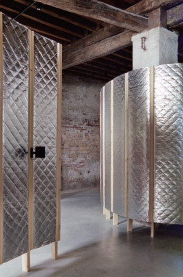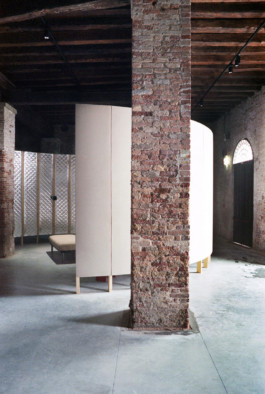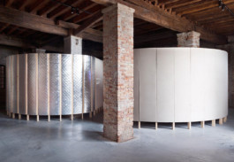 In collaboration with artist Marysia Lewandowska SA designed the V&A Pavilion for the Venice Art Biennale in 2019. The curved wall of the installation danced around the existing columns and formed two enclaves, one lined in roofing insulation for the sound installation, and the other in a simple canvas onto which Lewandowska’s film was projected.